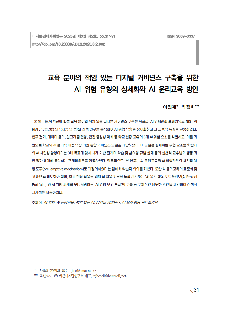 논문: 교육 분야의 책임 있는 디지털 거버넌스 구축을 위한 AI 위험 유형의 상세화와 AI 윤리교육 방안
